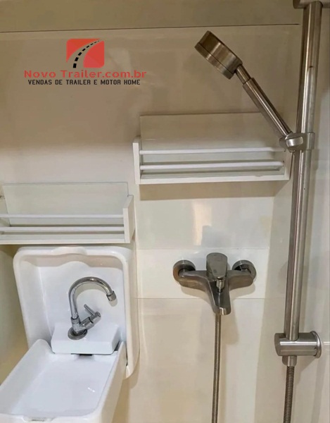 DUAS BOMBAS D’ÁGUAS AUTOMÁTICAS, AQUECEDOR DE PASSAGEM LORENZETTI, VÁLVULA ELÉTRICA COM ACIONAMENTO INTERNO PARA DRENAR ÁGUA NEGRA, TANQUE DE ÁGUA POTÁVEL DE 240 LITROS, TANQUE DE ÁGUA SERVIDA DE 70 LITROS E TANQUE DE DETRITOS 90 LITROS.