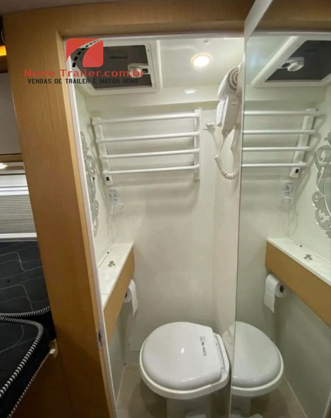 NO BANHEIRO SECO CONTA COM VASO DOMETIC COM ACIONAMENTO NO PEDAL, DUCHA HIGIÊNICA, EXAUSTOR, ARMÁRIOS, ESPELHO, SECADOR DE TOALHA E SECADOR DE CABELO.