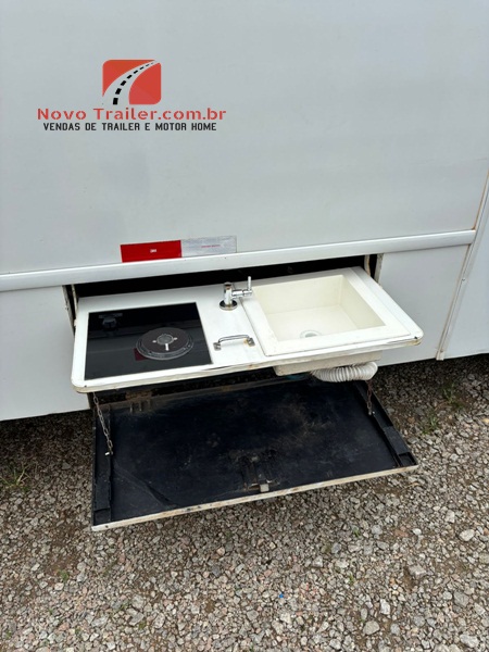 NA PARTE EXTERNA CONTA COM BAGAGEIRO, TOLDO DE ROLO NACIONAL MANUAL E COZINHA EXTERNA COM FOGÃO DE UMA BOCA E PIA.