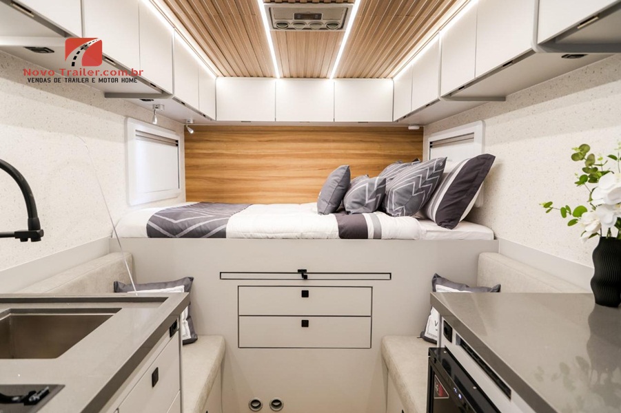 QUARTO CONTA COM CAMA DE CASAL FIXA NA TRANSVERSAL, ARMÁRIOS AÉREOS, JANELA LATERAL COM BLACKOUT E TELA MOSQUITEIRA, AR CONDICIONADO 12V.